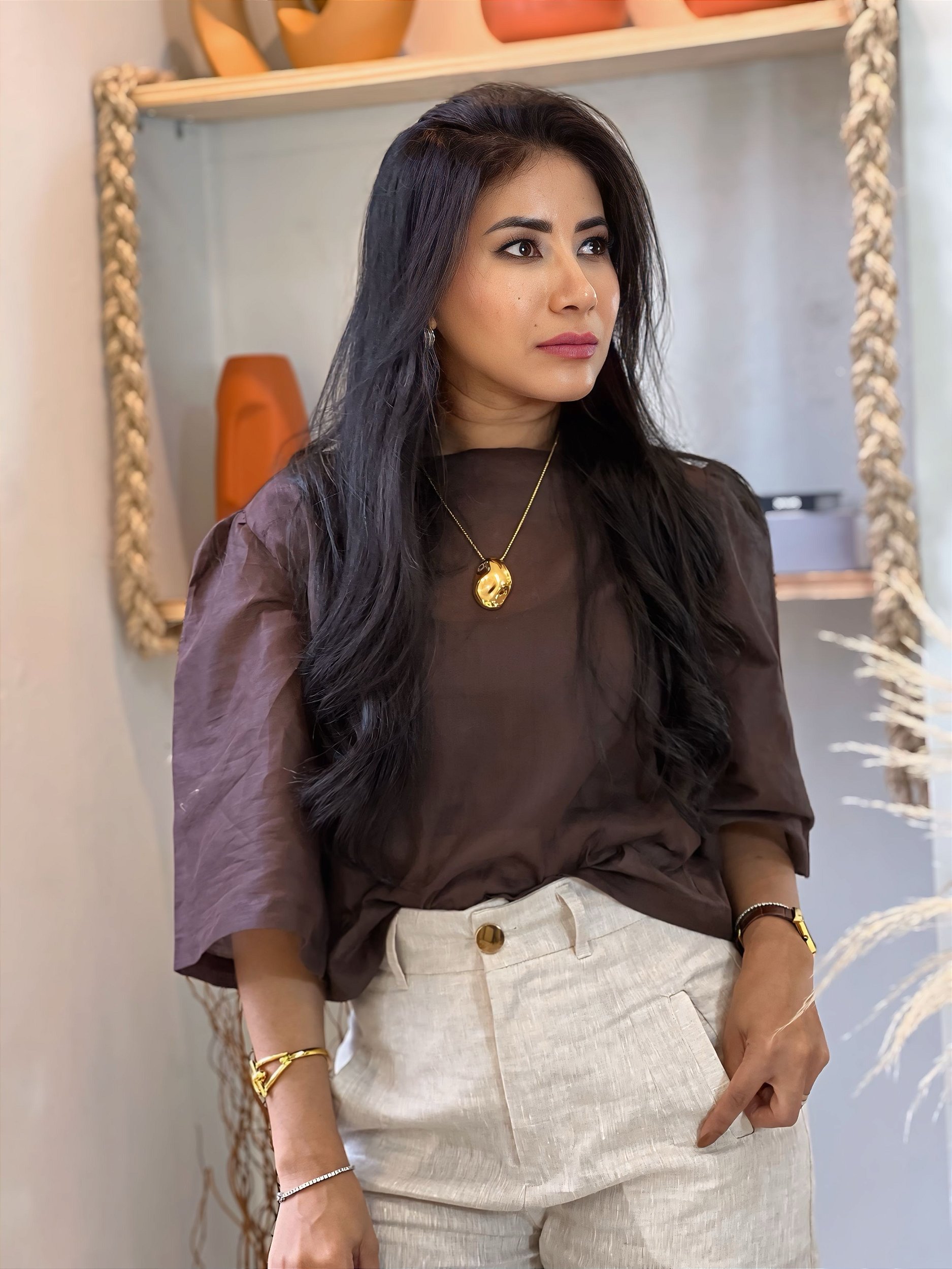 Blusa Rami Marrom Café Gola Barca E Manga Evasê