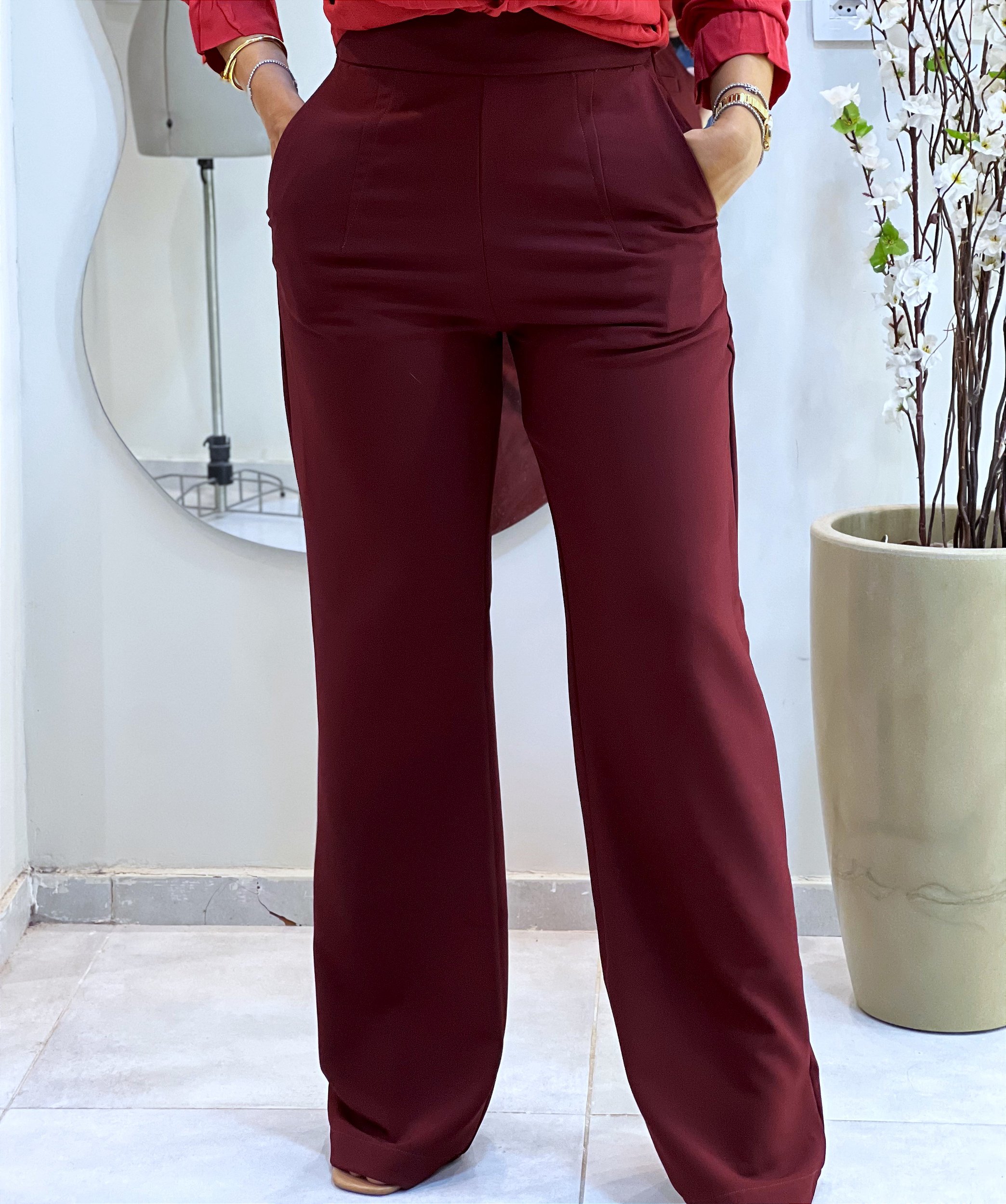 Essa Calça Pantalona em tecido de alfaiataria é uma escolha elegante e versátil para seu guarda-roupas.