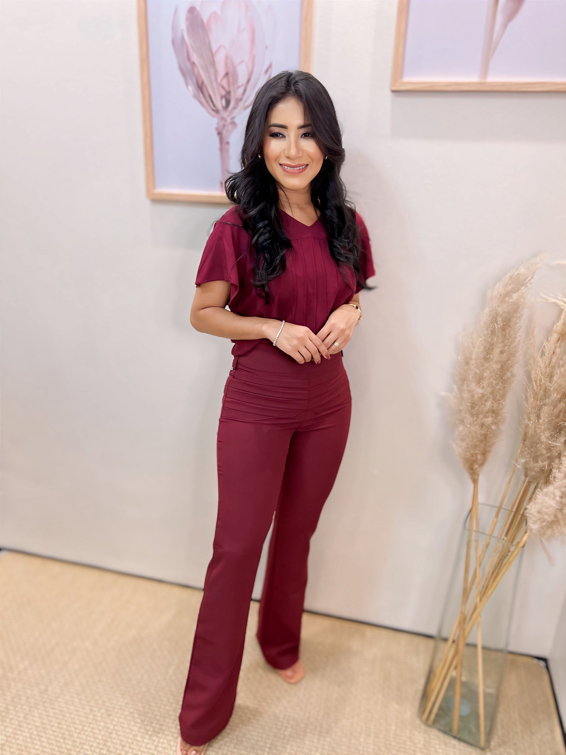 Calça Alfaiataria Vinho Flare com Nervuras Horizontais no Quadril e Bolsos