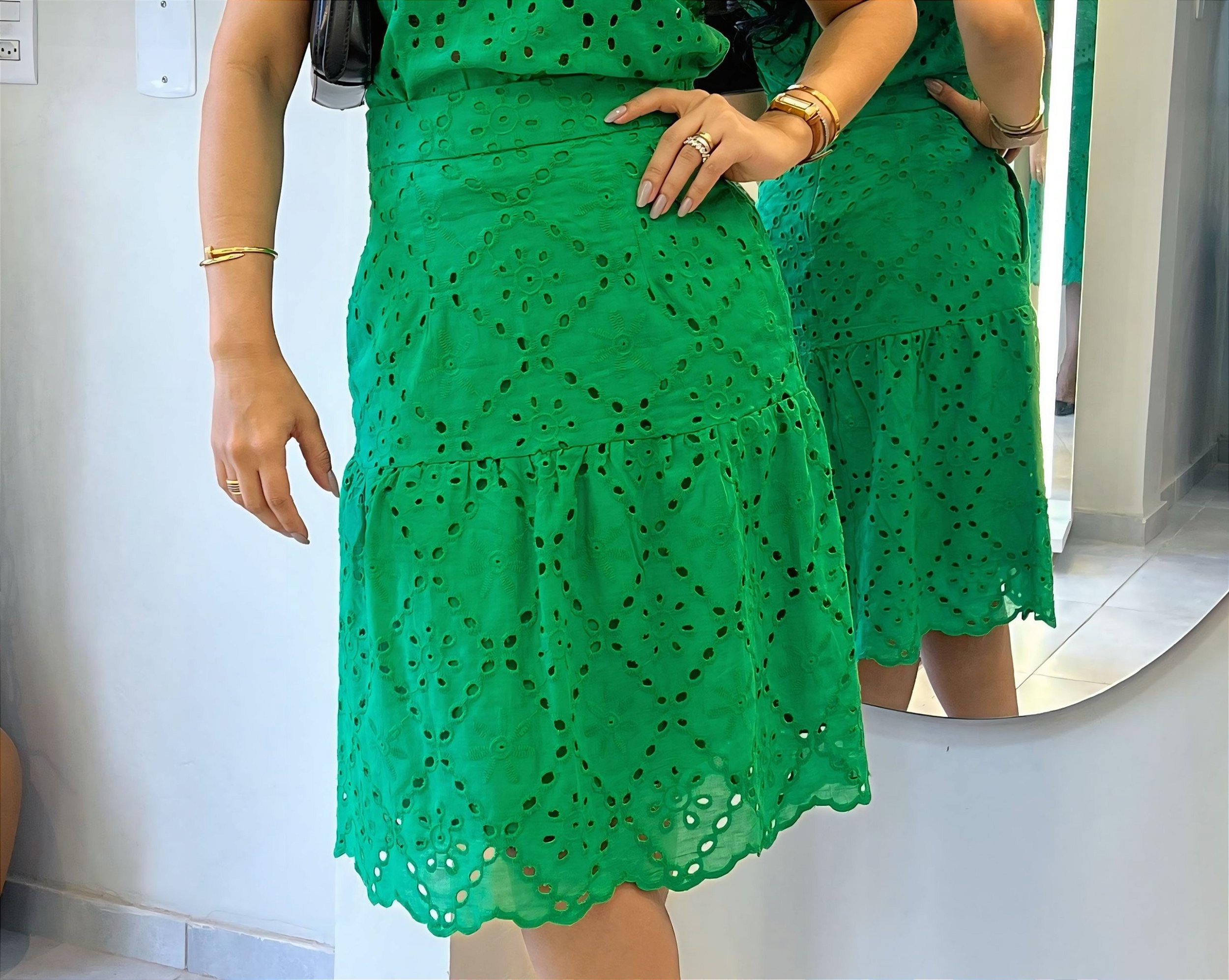 Saia Lese Verde Garrafa Midi com Bolsos e Babados e Acabamento Especial na Barra